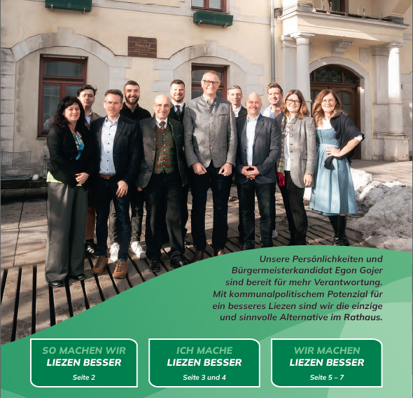 Die aktuell wohl heiß begehrteste Broschüre in Liezen. Darin stellen sich unsere Persönlichkeiten und unser ÖVP Bürgermeisterkandidat Egon Gojer vor. Wir sind bereit für mehr Verantwortung. Mit kommunalpolitischem Potenzial für ein besseres Liezen sind wir die einzige und sinnvolle Alternative im Rathaus. Oberdrein sind die inhaltlichen Schwerpunkte der ÖVP Liezen mit Hausverstand und Weitblick konzipiert und so auch in der aktuellen finanziellen Situation der Stadt besser umzusetzen.